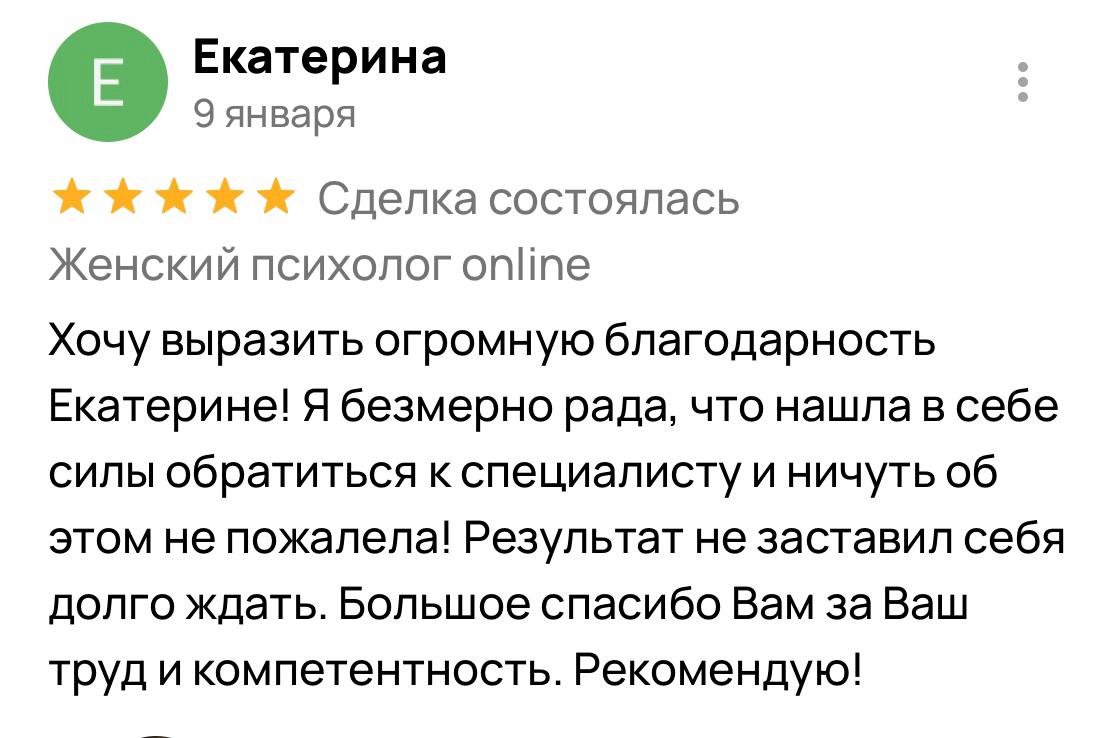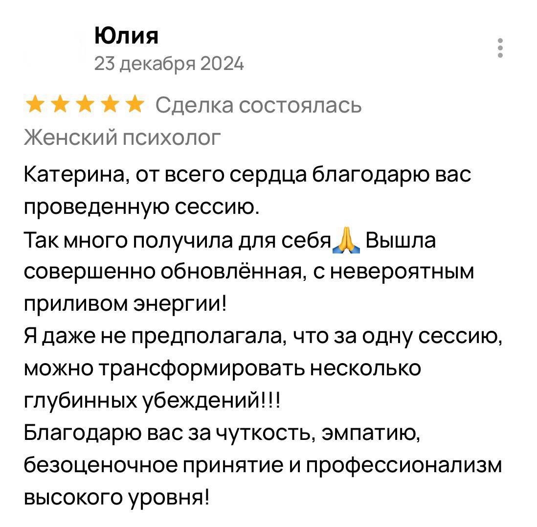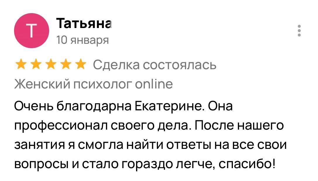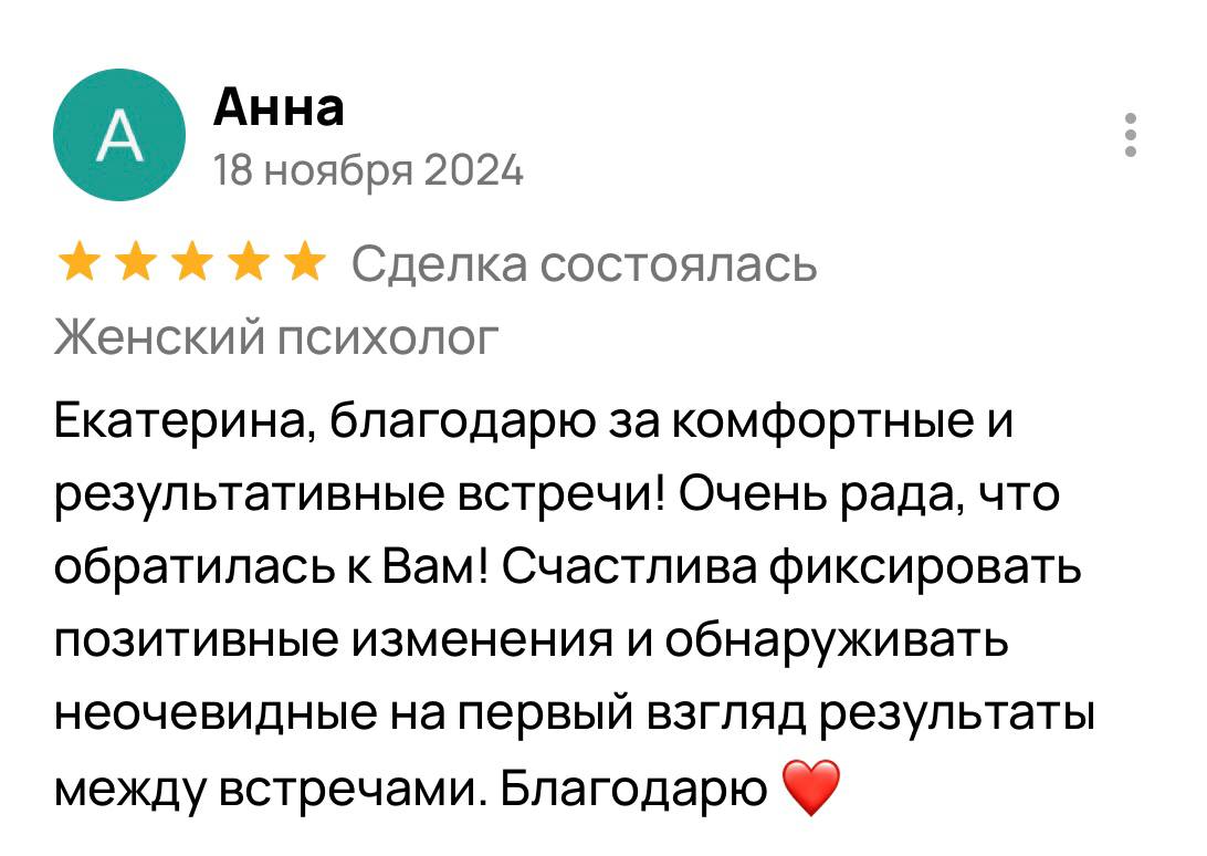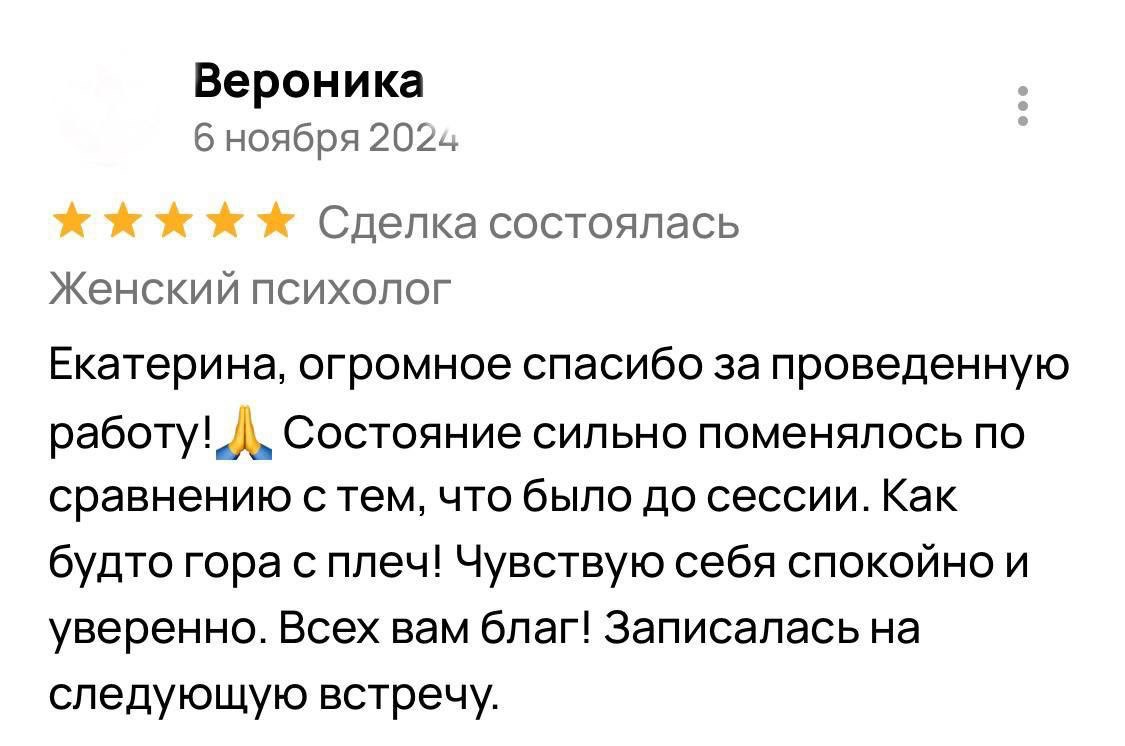 Я гарантирую 100% включение в вашу ситуацию и подбор методик, подходящих именно вам. Результат зависит от нашей совместной работы: вашей мотивации, регулярности встреч и готовности применять новые навыки в жизни. Клиентки, которые активно участвуют в процессе, отмечают устойчивые изменения уже после 5 сессий, а первые сдвиги часто чувствуют после 2-3 встреч.