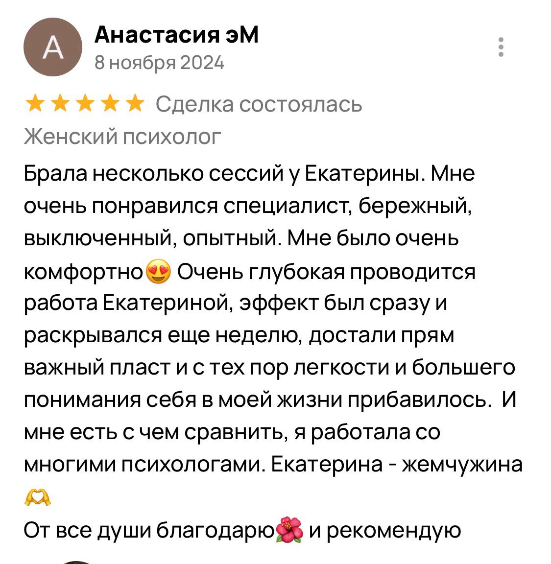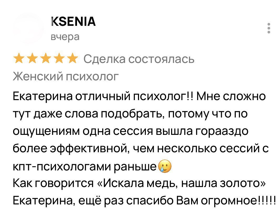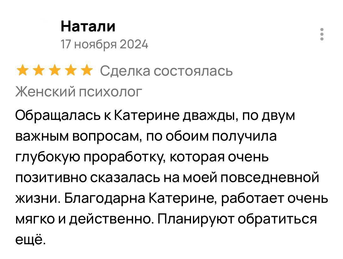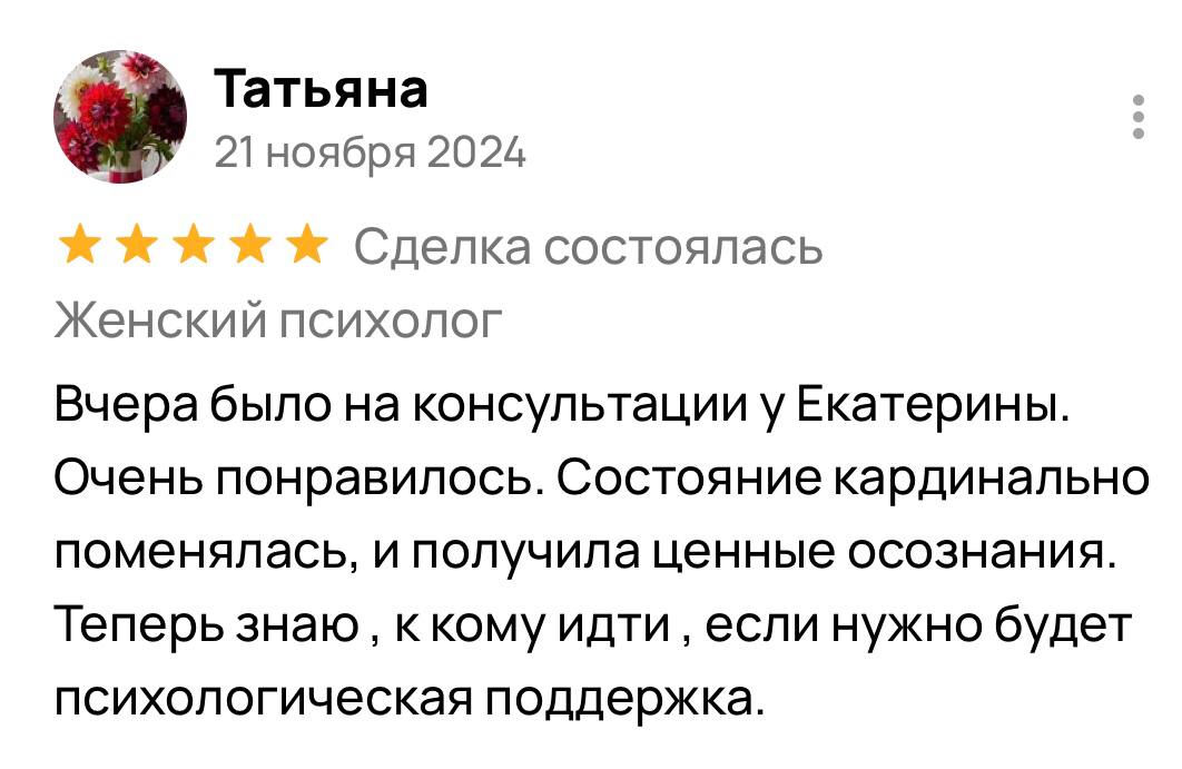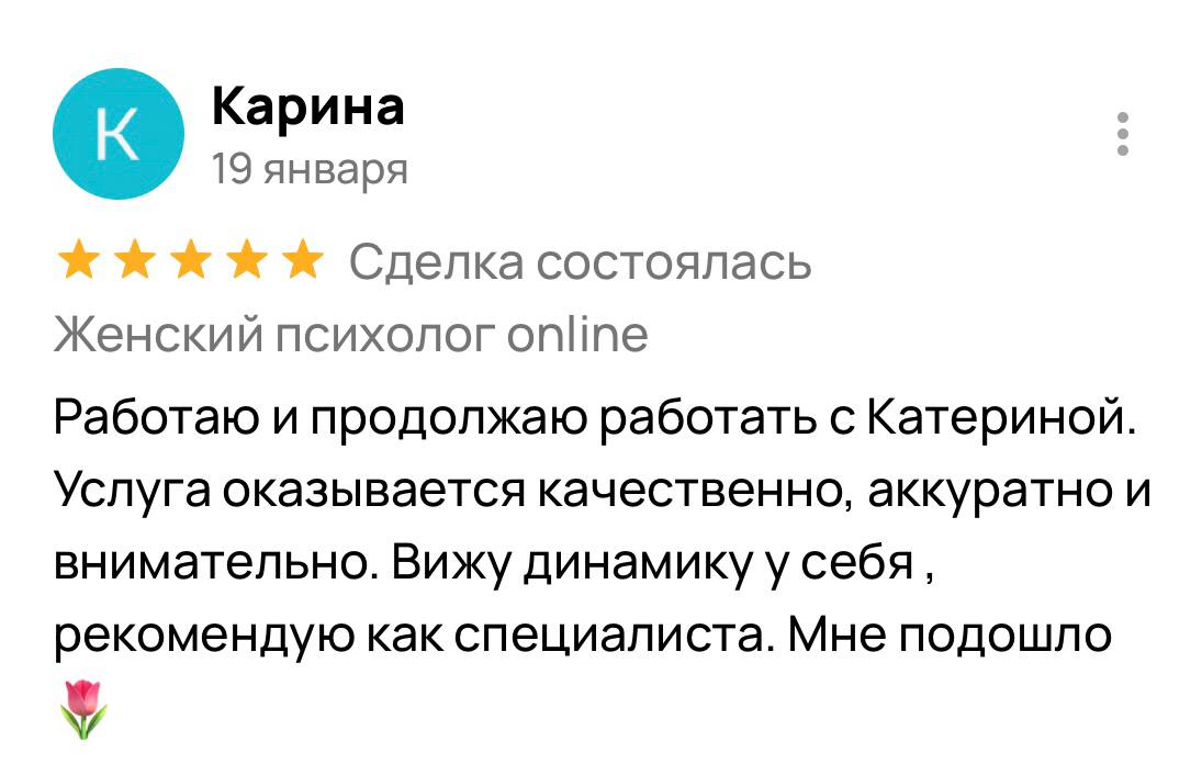 Я гарантирую 100% включение в вашу ситуацию и подбор методик, подходящих именно вам. Результат зависит от нашей совместной работы: вашей мотивации, регулярности встреч и готовности применять новые навыки в жизни. Клиентки, которые активно участвуют в процессе, отмечают устойчивые изменения уже после 5 сессий, а первые сдвиги часто чувствуют после 2-3 встреч.
