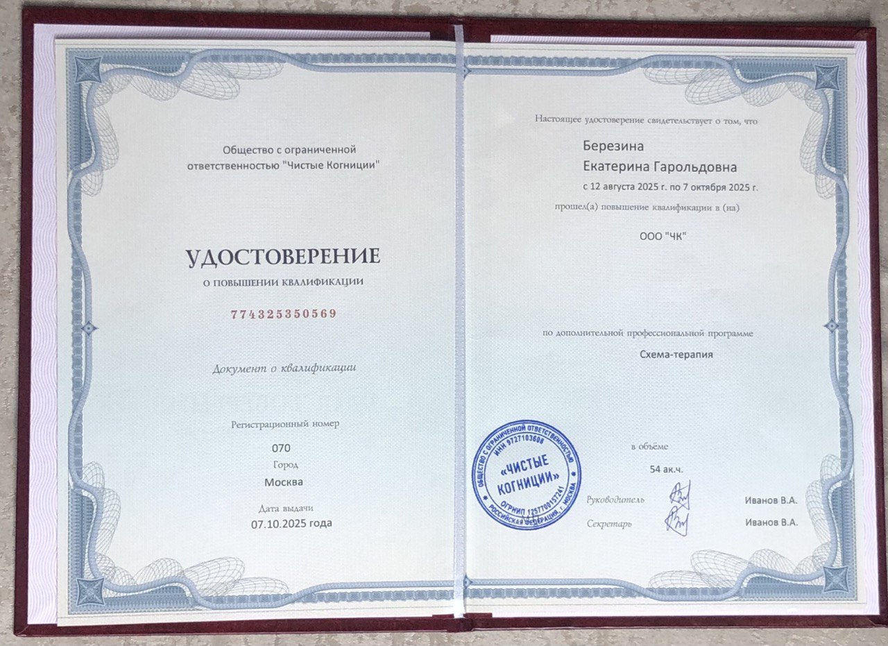 - Удостоверение о повышении квалификации ""Схема-терапия""