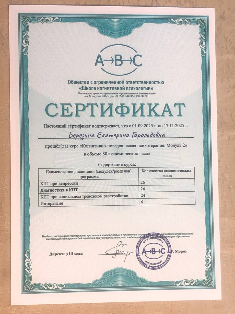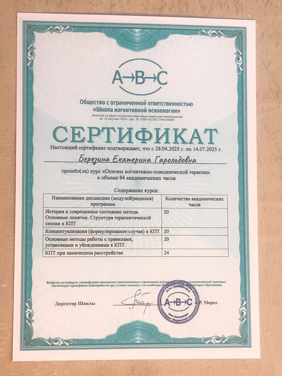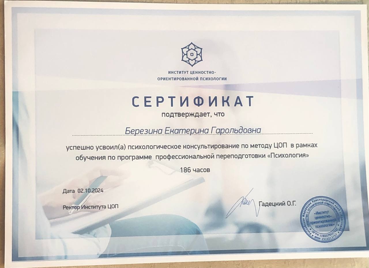- Сертификат – школа Когнитивной психологии – курс «Основы когнитивно-поведенческой терапии»