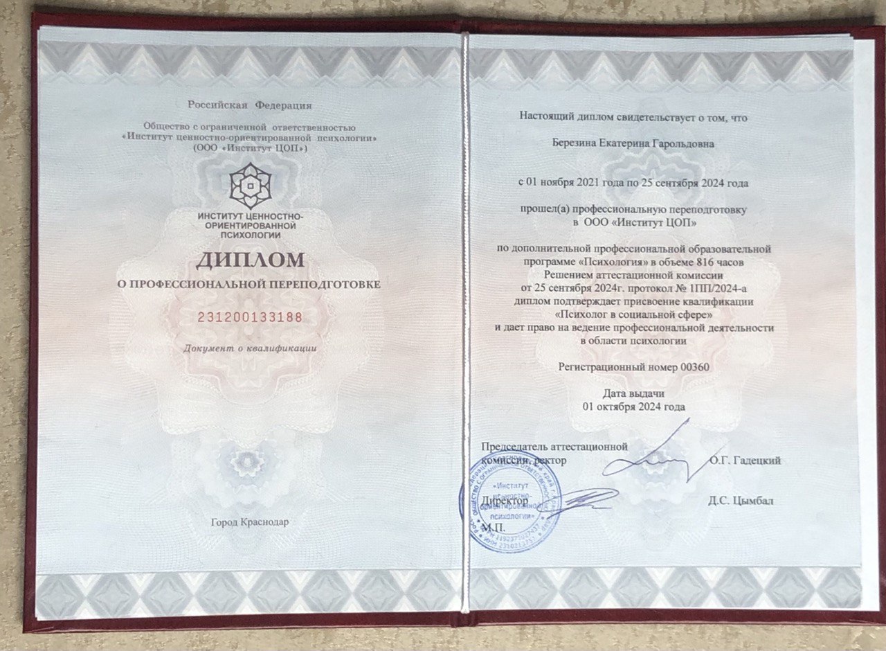 - Диплом по профессиональной переподготовке - Институт Ценностно-ориентированной Психологии (обучение 3 года ЦОП терапии и коучинга)