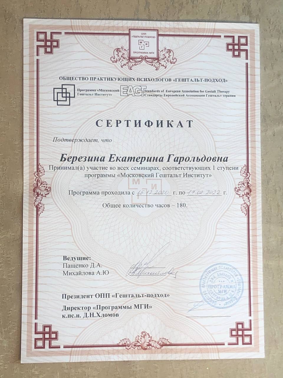 - Сертификат - групповая гештальт-терапия и обучение (программа Московский Гештальт Институт)