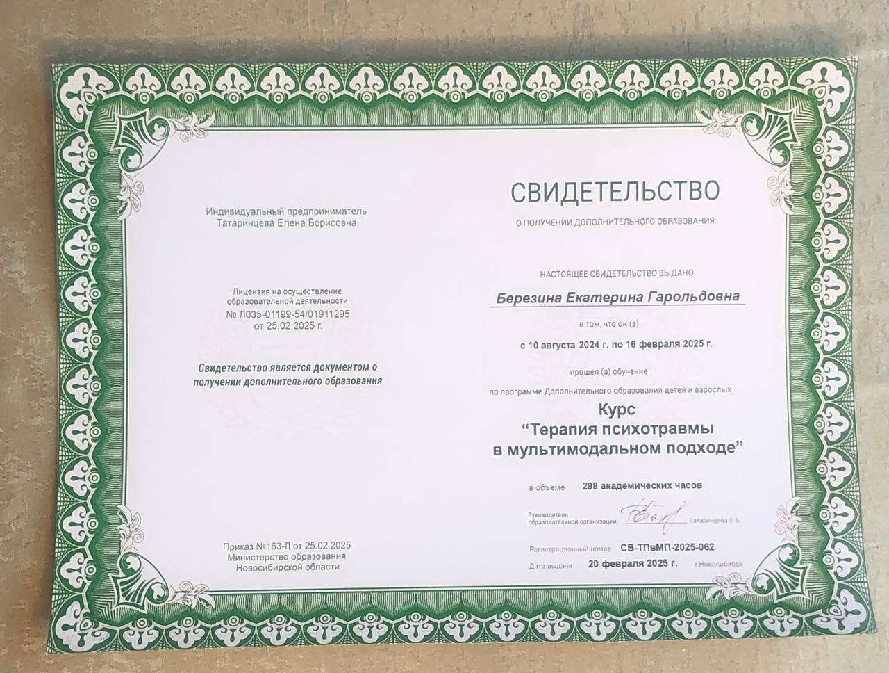 - Сертификат - курс «Терапия психотравмы в мультимодальном подходе» Онлайн Школа Елены Татаринцевой