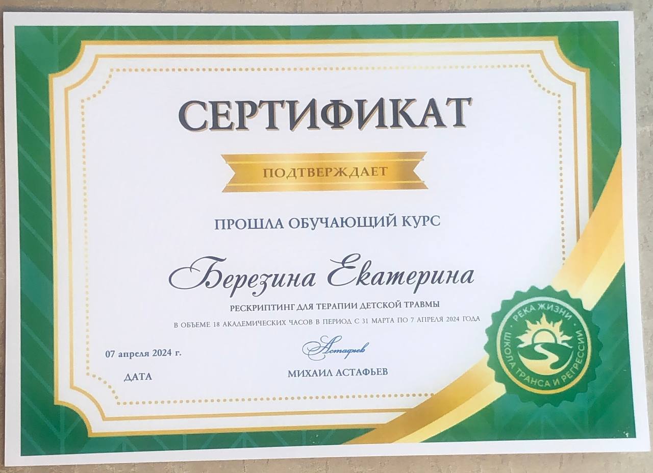 - Сертификат - курс «Рескриптинг для терапии детской травмы» в Школе транса и регрессии «Река жизни»