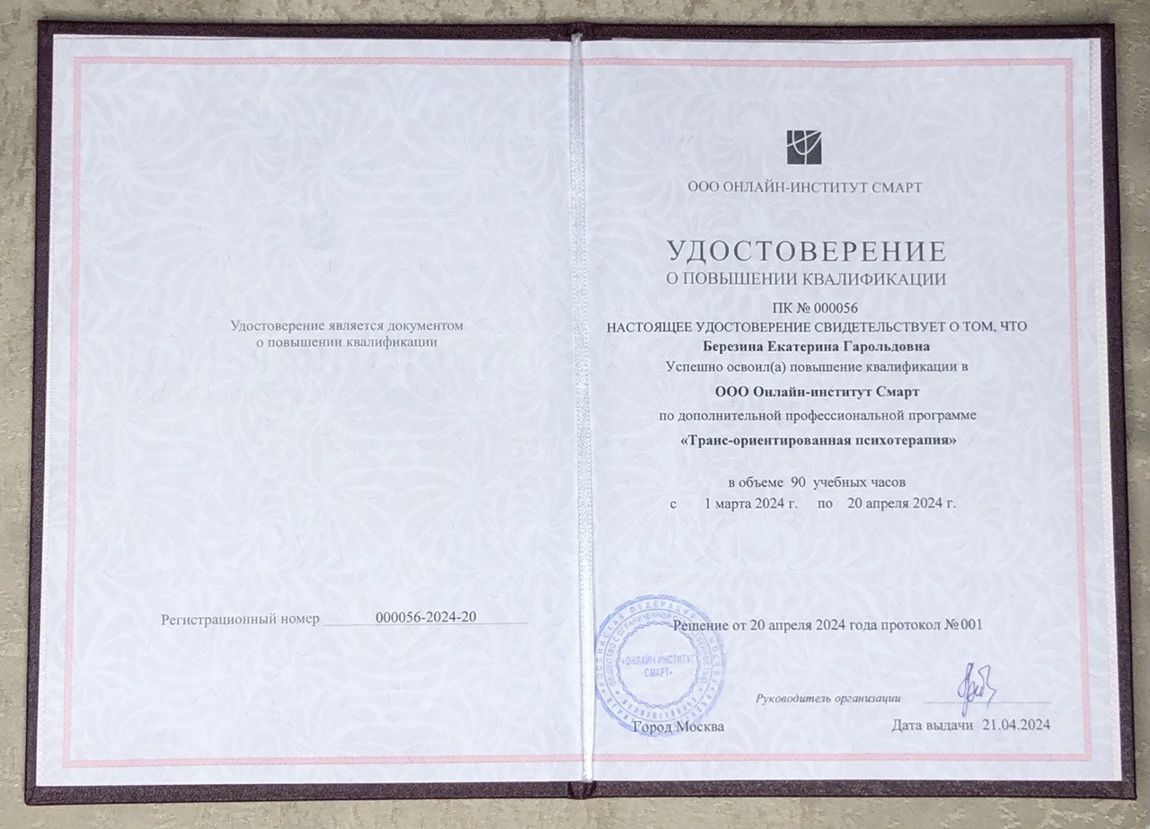 - Удостоверение о повышении квалификации - Международный онлайн институт психологии Smart - транс-ориентированная психотерапия