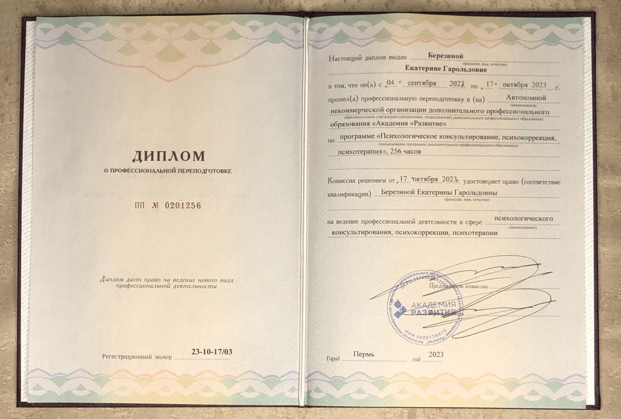 - Диплом по профессиональной переподготовке по программе "Психологическое консультирование, психокоррекция, психотерапия"